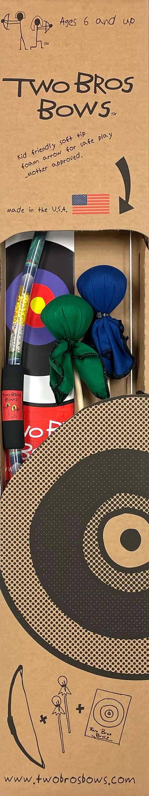 Bow provides hours of imaginative fun. Hand assembled in the US and third party tested for safety. Each bow comes with two arrows and a tri-fold target.