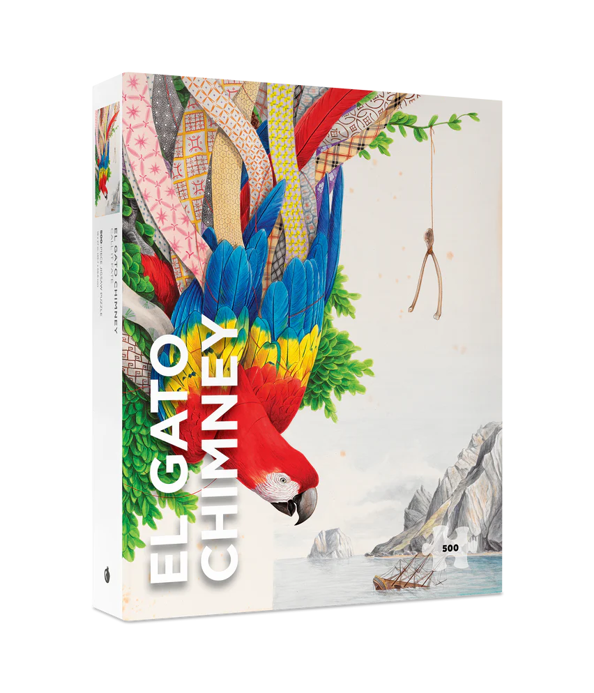 Medieval storytelling meets 21st-century fantasy in the Surrealist art of El Gato Chimney. Inspired by everything from graffiti and steampunk to alchemy and spiritualism, the artist brings to life a mystical realm of brilliantly colored birds bearing the weight of social baggage. His introspective paintings are laced with clues and symbolism about society’s virtues and vices. Through the eyes of the diving parrot in Call It Fate, might the shipwreck be Mother Nature’s will in action, or as simple and arbitrary as the snap of a wishbone? Ponder the possibilities as you assemble this 500-piece puzzle.