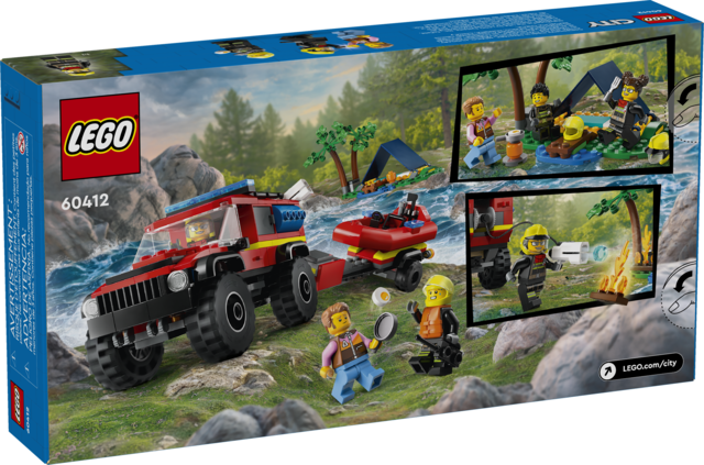 • What’s in this LEGO® building set? – Everything kids need to builda toy 4x4 fire truck, trailer, rescue boat, tent and a camping scene with a campfire, plus a camper and 2 firefighter minifigures