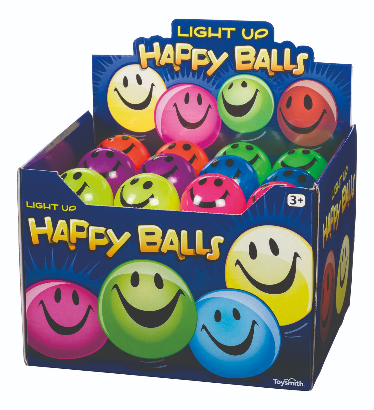 The Light Up Happy Balls from Toysmith come in 6 vibrant colors and flash multicolored lights. Color options include red, purple, yellow, hot pink, green, and blue. Each ball measures just over 2 inches in diameter and has a smiling grin and black eyes. Made for durable play, these high-bounce balls are designed with high-quality rubber material. Nonreplaceable batteries included.